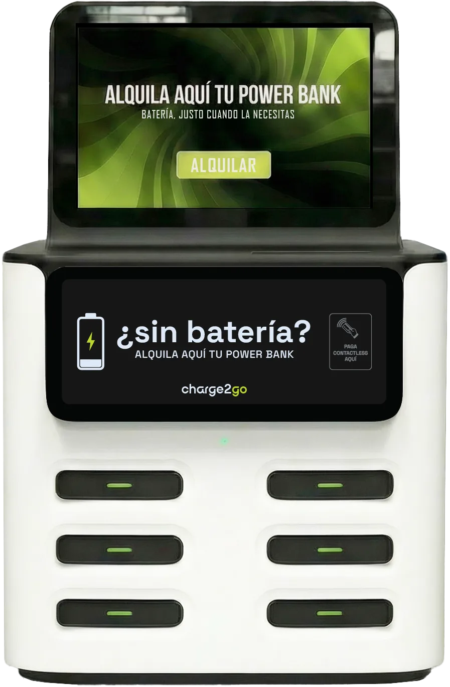 Una estación de alquiler de powerbanks es un dispositivo instalado en un local público que permite a los clientes tomar prestada una batería externa, cargar su móvil y devolverla en cualquier estación de la red. charge2go instala estas estaciones de forma gratuita en negocios con alta afluencia de personas.